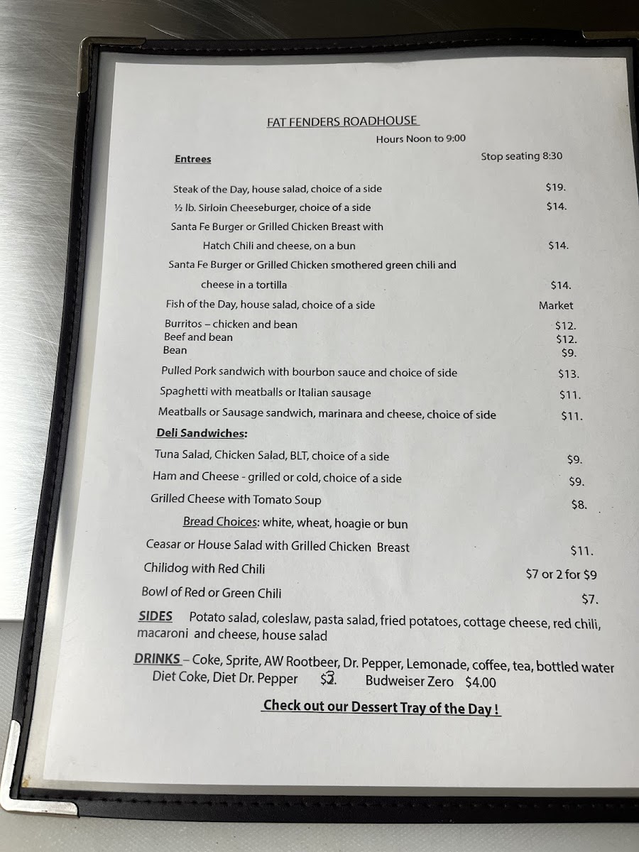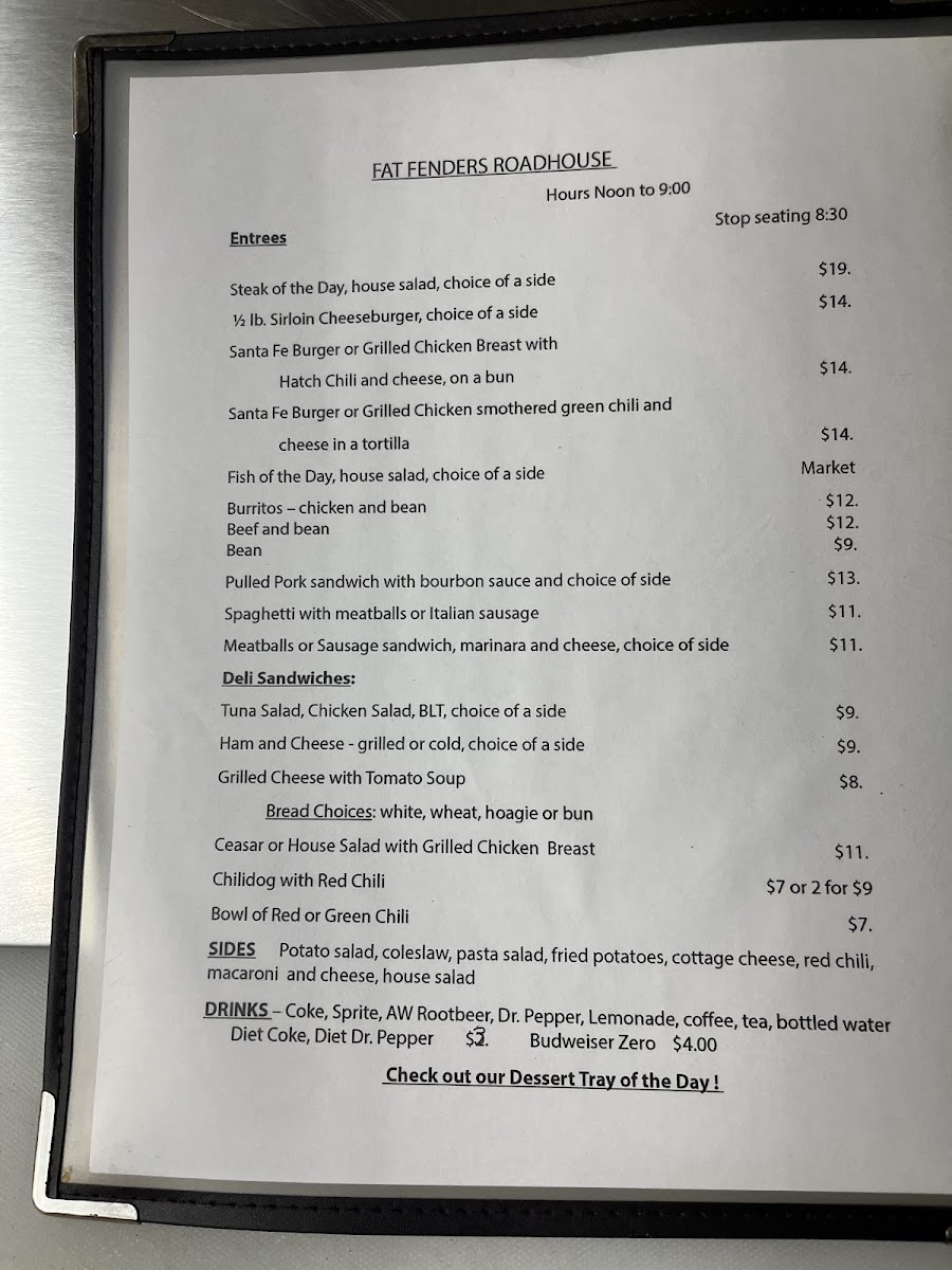 Fat Fenders Roadhouse Menu offers a diverse selection of hearty and satisfying dishes perfect for anyone looking to enjoy a delicious meal in Walsenburg, CO. The entrees include a variety of mouth-watering options, each served with a choice of side and a house salad. The Steak of the Day provides a flavorful, tender cut, while the 1/2 lb. Sirloin Cheeseburger offers a juicy, satisfying bite for burger enthusiasts. For a Southwestern twist, try the Santa Fe Burger or Grilled Chicken Breast, both topped with Hatch chili and melted cheese, either on a bun or smothered in a warm tortilla. The Fish of the Day is a great option for seafood lovers, offering a fresh, light dish to balance the heartier options.